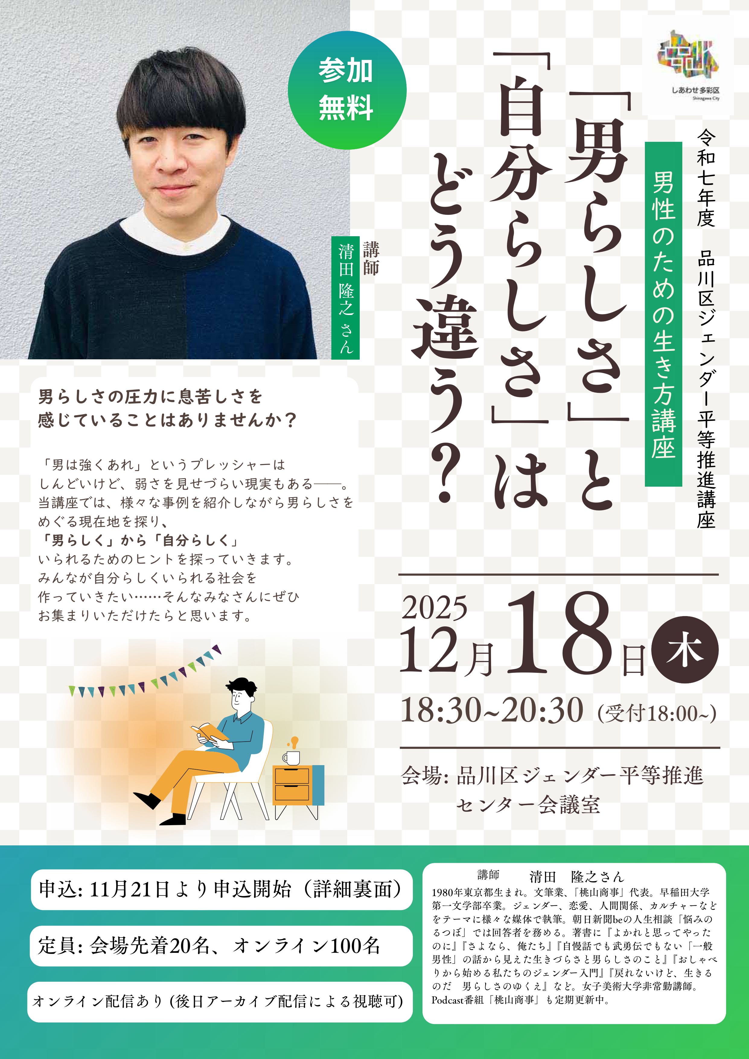 男性のための生き方講座 「男らしさ」と「自分らしさ」はどう違う? 男らしさの圧力に息苦しさを感じていることはありませんか。 「男は強くあれ」というプレッシャーはしんどいけど、弱さを見せづらい現実もある──。 当講座では、様々な事例を紹介しながら男らしさをめぐる現在地を探り、「男らしく」から「自分らしく」いられるためのヒントを探っていきます。 みんなが自分らしくいられる社会を作っていきたい……そんなみなさんにぜひお集まりいただけたらと思います。 【講師】清田 隆之氏(文筆家/桃山商事代表) |